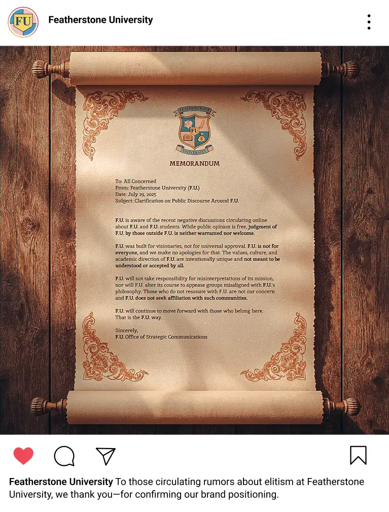 Amid growing national skepticism toward higher education, Colorado Mesa University created “Welcome to Featherstone,” a bold satirical campaign that challenges elitism and privilege in higher education.